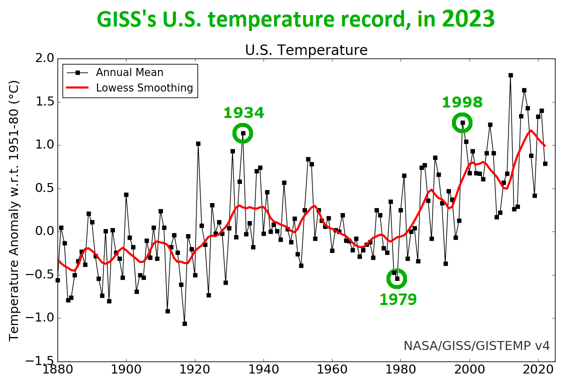In 1999, they showed 1934 as 0.54 °C warmer than 1998. But now they show 1934 as 0.12 °C cooler than 1998. They cooled 1934 and warmed 1998 by a combined total of 0.66 °C, conveniently “straightening the hockey stick handle,” considerably.
