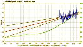 The mean sea level (MSL) trend at Rodrigues Island, Mauritius is 5.48 mm/year with a 95% confidence interval of ± 1.53 mm/year, based on monthly mean sea level data from 1986 to 2018. That is equivalent to a change of 1.80 feet in 100 years. (R‑squared = (?))