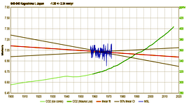 The mean sea level (MSL) trend at Kagoshima I, Japan is 0.00 mm/year with a 95% confidence interval of ± 0.00 mm/year, based on monthly mean sea level data from ???? to ????. That is equivalent to a change of 0.00 feet in 100 years. (R‑squared = (?))