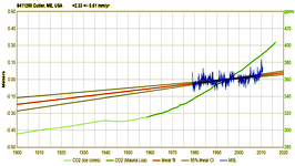 The mean sea level (MSL) trend at Cutler, ME, USA is 2.34 mm/year with a 95% confidence interval of ± 0.61 mm/year, based on monthly mean sea level data from 1979 to 2010. That is equivalent to a change of 0.77 feet in 100 years. (R‑squared = (?))