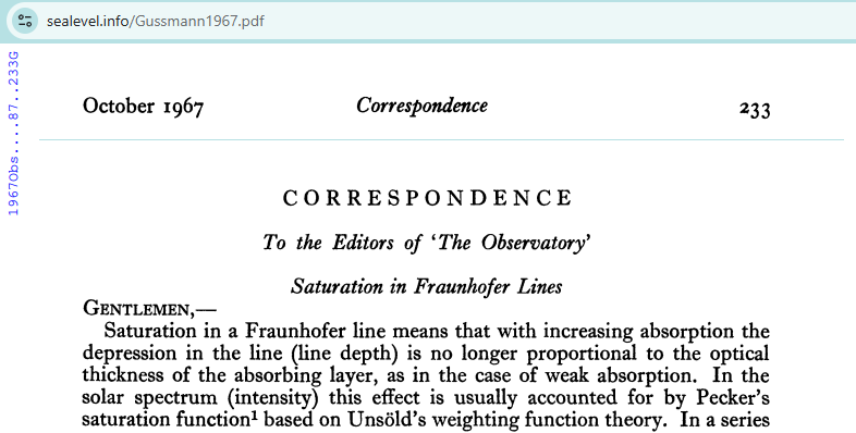 Excerpt: “Saturation in a Fraunhofer line means that with increasing absorption the depression in the line (line depth) is no longer proportional to the optical thickness of the absorbing layer, as in the case of weak absorption.”